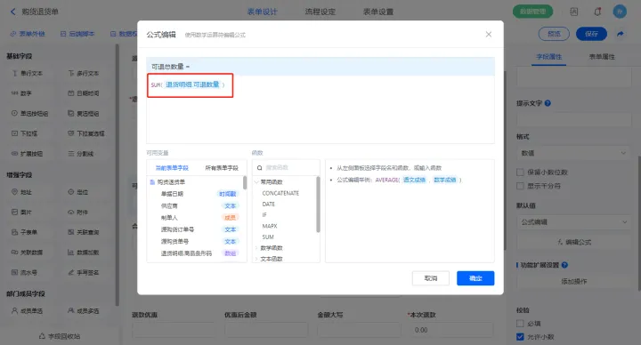 1)【退货明细.可用库存】、【退货明细.购货单价】、【退货明细.含税单价】、【退货明细.含税单价】、【退货明细.折扣额】、【退货明细.金额】、【退货明细.税率(%)】、【退货明细.税额】、【退货明细.价税合计】、【退货明细.价税合计】、【合计数量】、【合计折扣额】、【合计金额】、【合计税额】、【合计价税合计】、【优惠金额】、【优惠后金额】、【金额大写】、【商品统计】、【总采购费用】以上字段如2.2设置公式;选择【可退总数量】字段,设置默认值为公式编辑,如图设置公式;