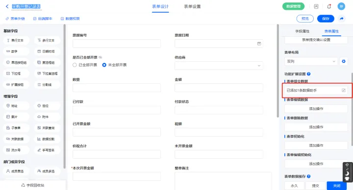 1)表单提交数据新增一条数据助手,名称为修改开票数据;