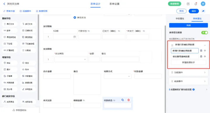 9)表单提交数据新增两条数据助手,名称分为新增付款辅助表数据、修改费用清单数据;