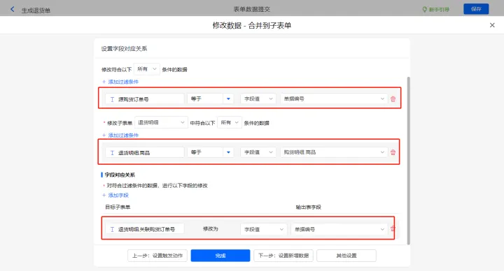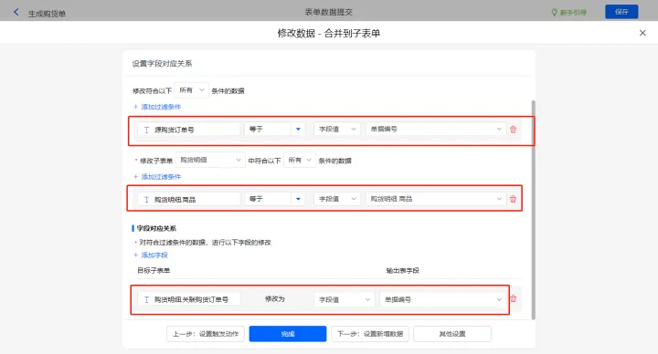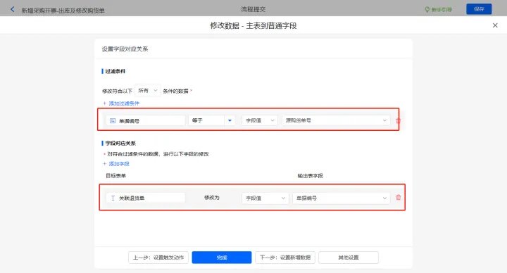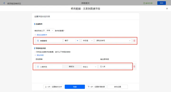 新增修改数据的执行动作,选择修改【购货单】表单,选择对应过滤条件,以及需要修改的字段,设置好点击【完成】并保存该数据助手;