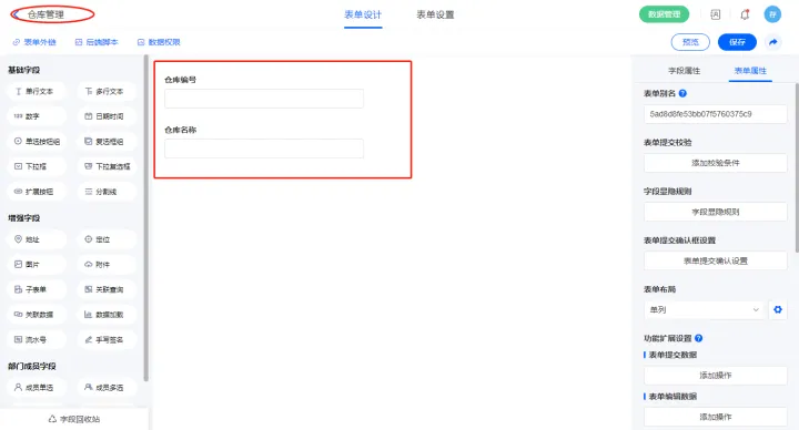 2)新增表单【仓库管理】,字段设置如下;