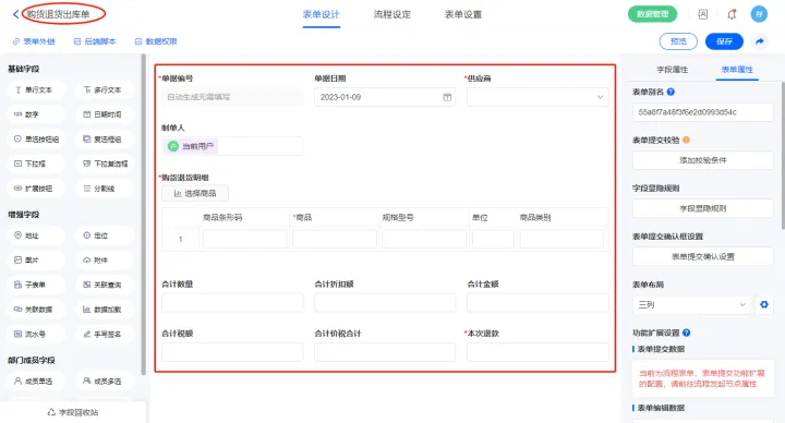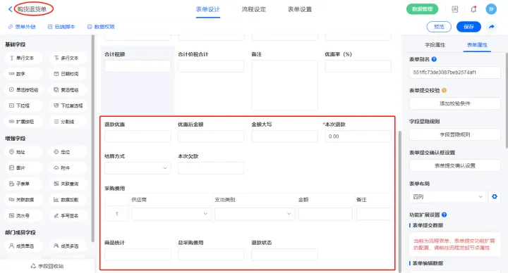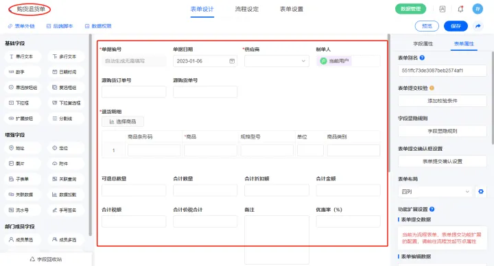 2.4、表单【购货退货单】字段及表单属性设置