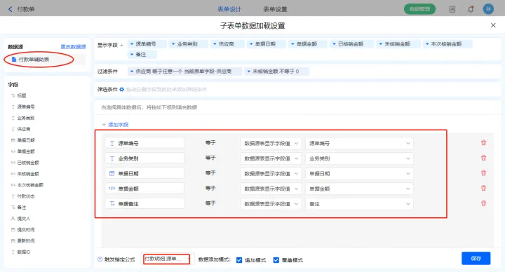 4)【付款明细】子表单字段,开启数据加载,数据源为【付款单辅助表】,添加过滤条件及设置赋值字段,触发公式为【源单编号】字段;