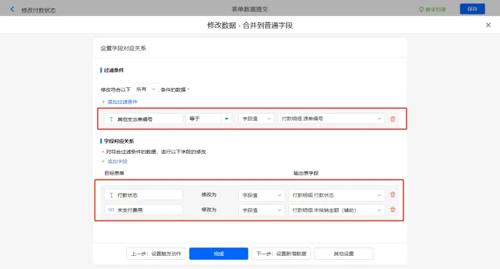 修改付款状态的数据助手,新增修改数据的执行动作,选择修改【付款单辅助表】表单,选择对应过滤条件,以及需要修改的字段,设置好点击【完成】并保存该数据助手;