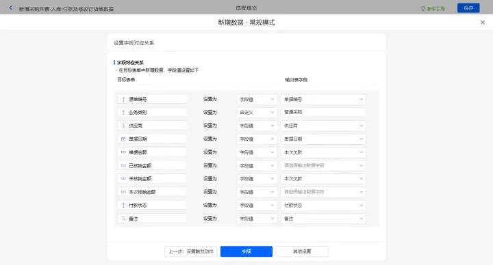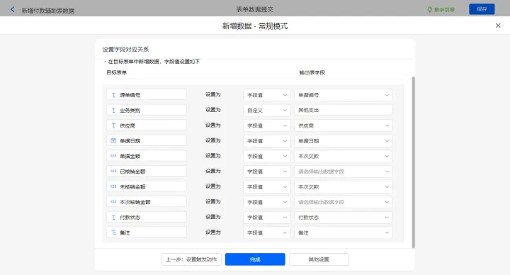 再新增新增数据的执行动作,选择目标表单【付款单表单】,选择对应字段,设置好点击【完成】并保存该数据助手;