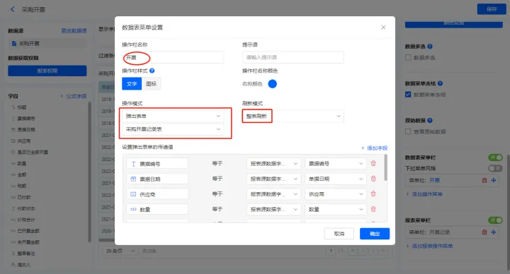 【开票】的菜单栏,设置刷新模式为整表刷新,操作模式设置为弹出表单【采购开票记录】;