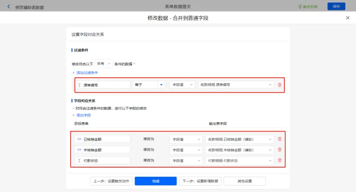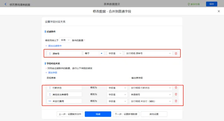 再新增修改数据的执行动作,选择修改【费用清单】表单,选择对应过滤条件,以及需要修改的字段,设置好点击【完成】并保存该数据助手;