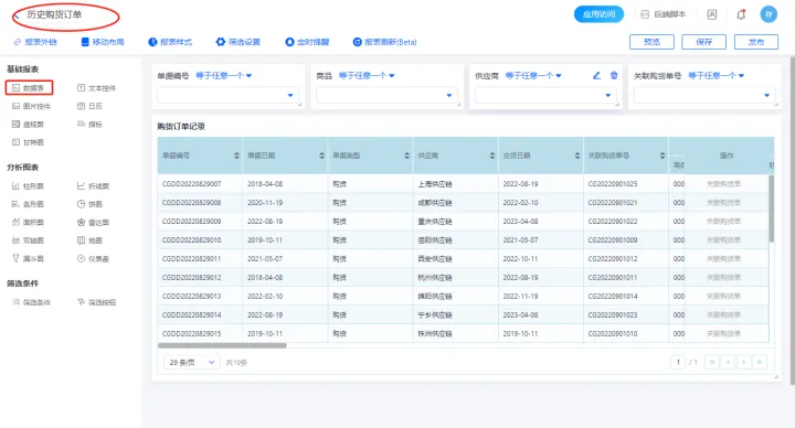 1)新增【历史订购单】报表,用基础报表【数据表】展示数据源为表单【购货订单】的数据;