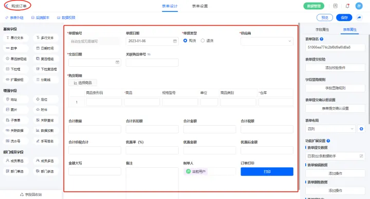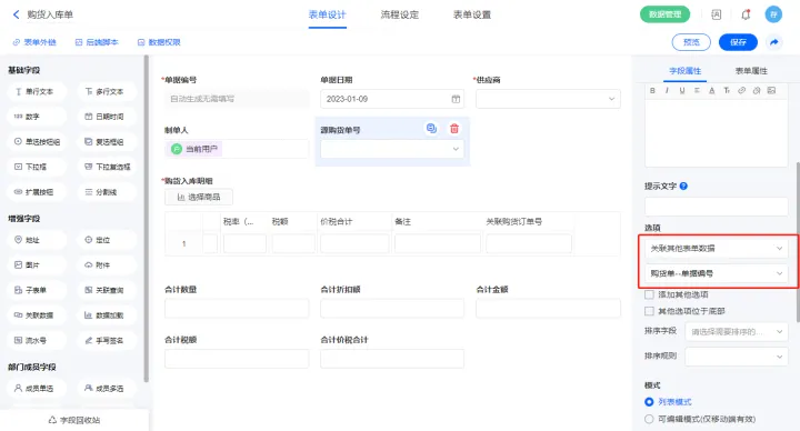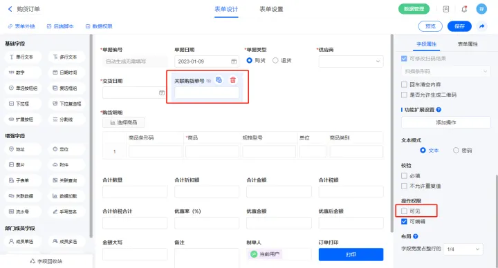 | 关联购货订单号 | 单行文本 |
