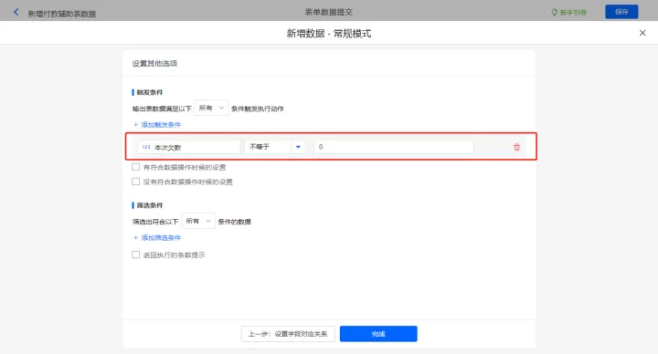 其他设置的触发条件为【本次欠款】不等于0,设置好点击【完成】并保存该数据助手;