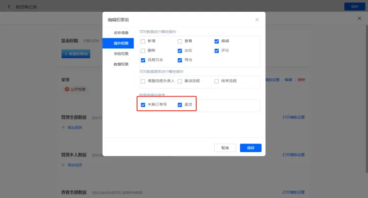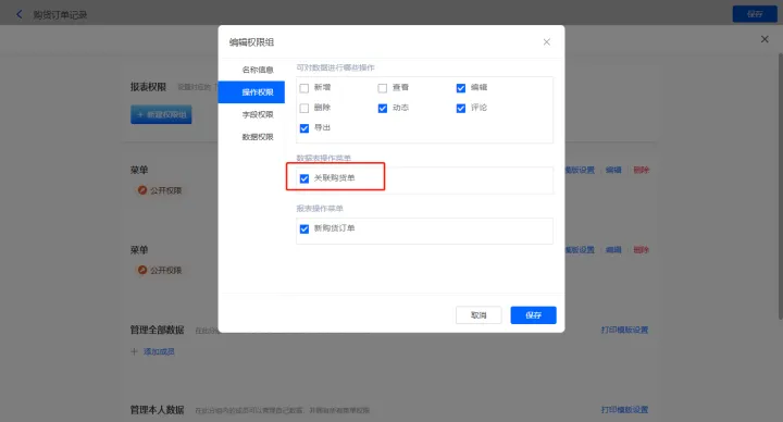 3)设置报表的权限,填入权限组名称,选择可操作的数据表菜单,点击【保存】;