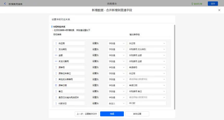 新增费用清单的数据助手,新增新增数据的执行动作,选择目标表单【费用清单】,选择对应字段,设置好点击【完成】并保存该数据助手;