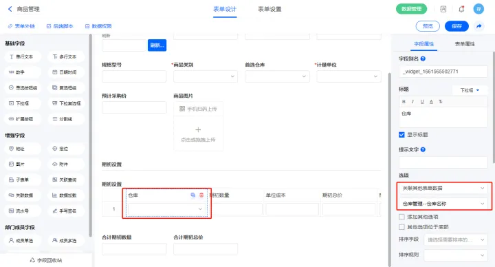3)【仓库】字段,选择设置为关联其他表单数据,关联仓库管理的【仓库名称】字段;