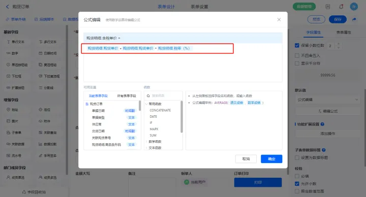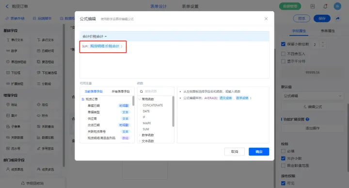 【期初设置.期初总价】字段设置默认值为公式编辑,如图设置公式;