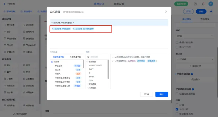 2)选择【付款明细.未核销金额】字段,设置默认值为公式编辑,如图设置公式;
