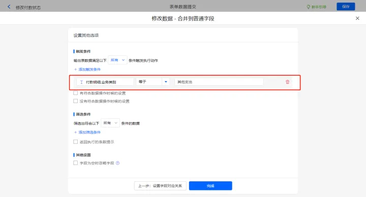 其他设置触发条件为【付款明细.业务类别】等于其他支出,设置好点击【完成】并保存该数据助手;