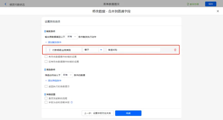 其他设置触发条件为【付款明细.业务类别】等于普通采购,设置好点击【完成】并保存该数据助手;
