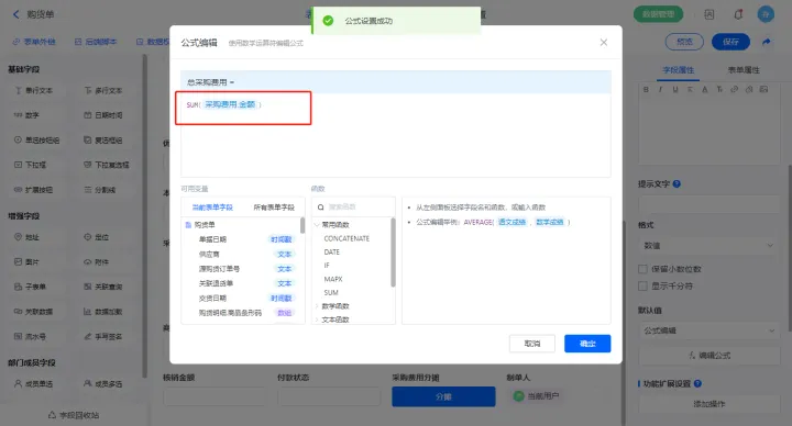 6)【合计金额】字段设置默认值为公式编辑,设置公式:“IF(业务类别=="支付销售/采购费用",SUM(支付明细.金额),SUM(支出明细.金额))”;