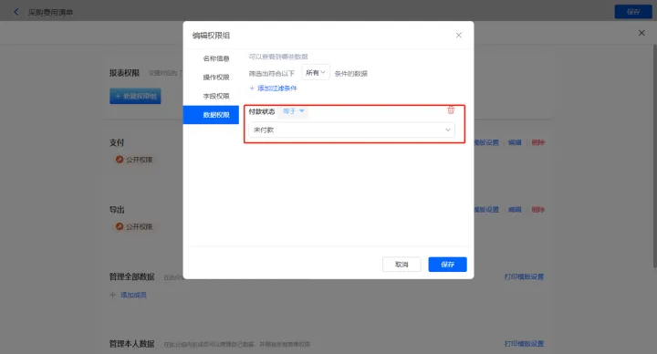 数据权限设置为【付款状态】等于未付款;