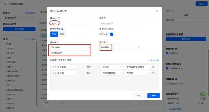 【支付】的菜单栏,设置刷新模式为整表刷新,操作模式设置为弹出表单【其他支出单】;