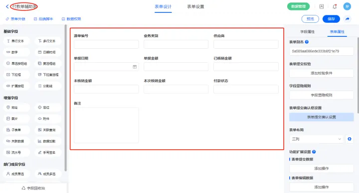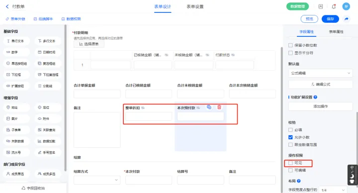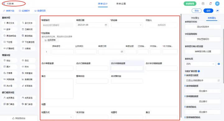 2.7、表单【付款单】字段及表单属性设置