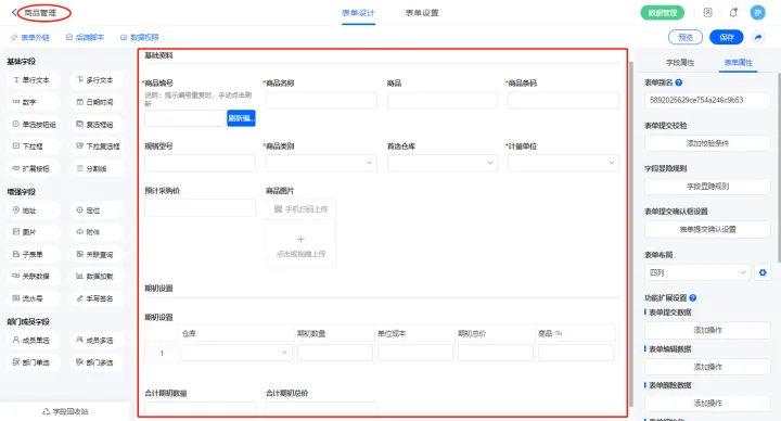 2.9、表单【商品管理】字段及表单属性设置