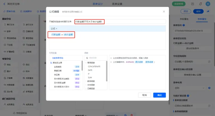 【付款金额】字段设置默认值为公式编辑,设置公式:“IF(业务类别=="支付销售/采购费用",SUM(支付明细.本次支付),SUM(支出明细.金额))”;