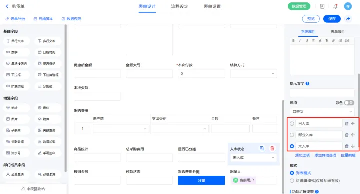 2.5、表单【购货入库单】字段及表单属性设置