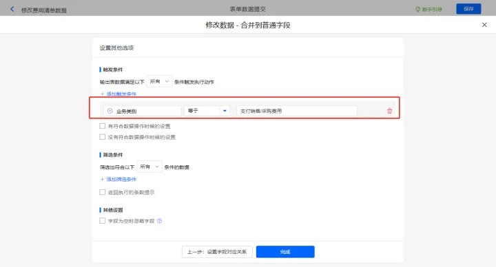 其他设置的触发条件为【业务类别】等于支付销售/采购费用,设置好点击【完成】并保存该数据助手;