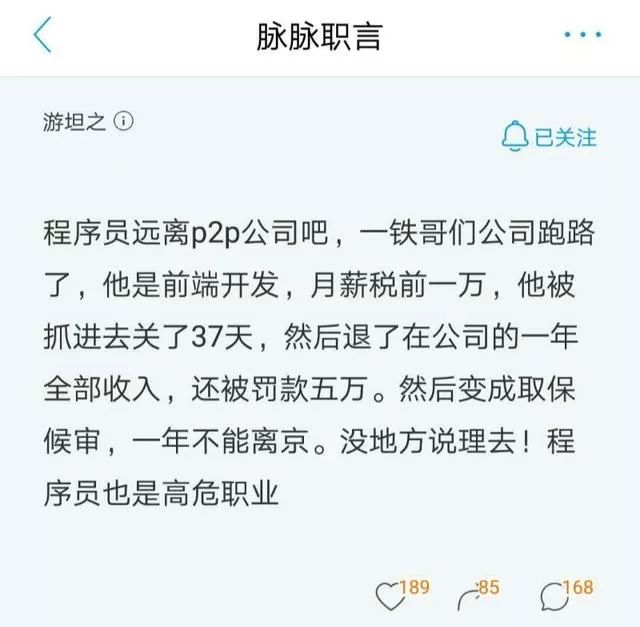 前段时间,有脉脉用户发帖称"P2P公司暴雷,前端程序员被抓":