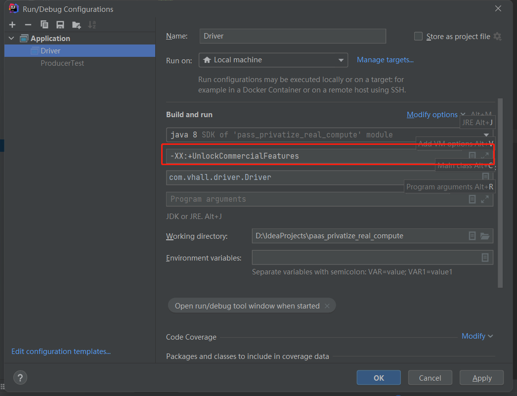 在 VM options 中添加 -XX:+UnlockCommercialFeatures 参数。