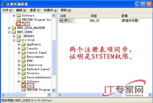 (S-1-5-18就是SYSTEM帐户的SID)。证明方法很简单:在HKCU下随便新建一个Test子项,然后刷新,再看看HKUS-1-5-18