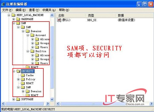 操作:打开注册表管理器,尝试访问HKEY_LOCAL_MACHINESAM和HKEY_LOCAL_MACHINESECURITY,现在应该可以无限制访问了。(图6)