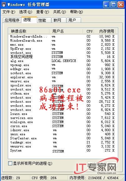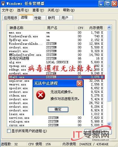 任务管理器”,发现有个可疑进程“86a01.exe”,在Administrator管理员下无法结束进程(图9),当然更无法删除在系统目录下的病毒