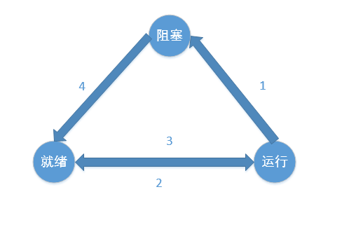 在操作系统发现进程不能进行下去时,发生转换1。转换2和3是由进程调度程序引起的,进程调度程序是操作系统的一部分。当操作系统认为某个进程运行的时间足够久了,那么操作系统会将当前运行的程序切换到就绪态,让另一个处于就绪态的进程开始执行。另外,在等待例如外部键盘输入时,进程会被切换到阻塞态,一旦完成数据的输入会直接切换到运行态。