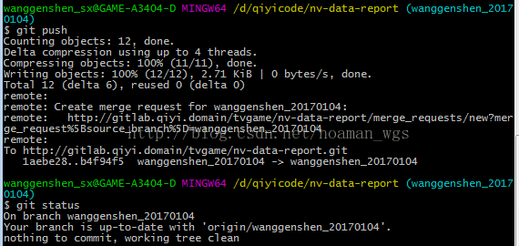 如上图,我所在的分支为wnaggenshen_20170104,即为将要上传代码到该分支的地方;