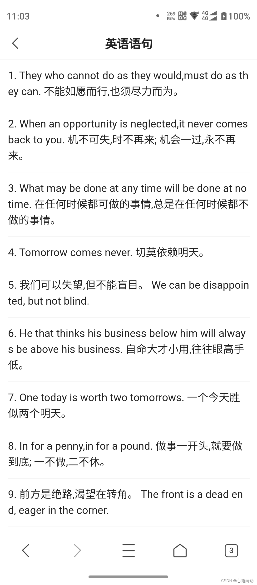 11:03 352 Big “28110004, < fifiififii 1. They who cannot do as they would,must do as th ey can. $§E§DEfifiiiE3fi§73fifi7flo 2. When an opportunity is neglected,it never comes back to you. ?I‘J'L7FEJ9iE‘J‘7Ffifié; ?HLfi—iiiféfifi 3 What may be done at any time will be done at no time. EiEiTEJ‘iIEfiB—JME’JEEHEIE'EEEflBfl‘iIfiWF iflflg$ 1m 4. Tomorrow comes never. tflfifififififiio 5 ?til]flfl9€¥,ifl7i<§ EEEO We can be disappoin ted, but not blind. 6. He that thinks his business below him will alway s be above his business Eh“ p,fl<7_i'/JFfi EEEEF}? iEEo 7. One today is worth two tomorrows. —’IV7‘3EH$