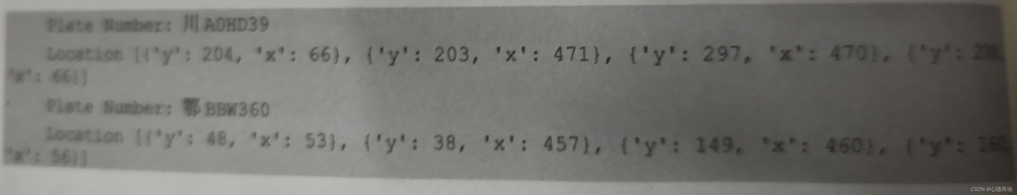 #车牌识别 from aip import AipOcr import cv2 as cv import numpy as np APP_ID='30429525' API_KEY='gk5YyWAxggZGPmFtqGLQraeF' SECRET_KEY='I0yINQbTicjmAWZDfA8mlFWbvGKMx5EX' client=AipOcr(APP_ID,API_KEY,SECRET_KEY) def get_file_content(filePath): with open(filePath,'rb') as fp: return fp.read() image=get_file_content('D:Image\test1.jpeg') options={} options['multi_detect']='true' #支持多车牌识别 ret=client.licensePlate(image,options) #调用API进行车牌识别 result=ret['words_result'] #将车牌识别结果保存在字典中 img=cv.imread('D:Image\test1.jpeg') for i in range(len(result)): plate_num=result[i]['number'] #显示被识别的车牌 loc_coordinates=result[i]['vertexes_location'] #显示出车牌坐标 print('Plate Number:',plate_num) print('Location',loc_coordinates) #用矩形来标记所识别的车牌的位置 cv.rectangle(img,(np.int(loc_coordinates[0]['x']),np.int(loc_coordinates[0]['y'])), (0,255,0),2,cv.LINE_8,0) cv.imshow('result',img) cv.waitKey(0) cv.destroyAllWindows()