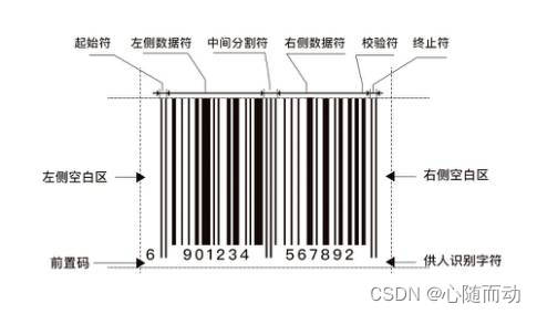 条形码一般有8个区域,:左侧空白区,起始符,左侧数据符,中间分隔符,右侧数据符,效验符,,终止符,右侧空白区。
