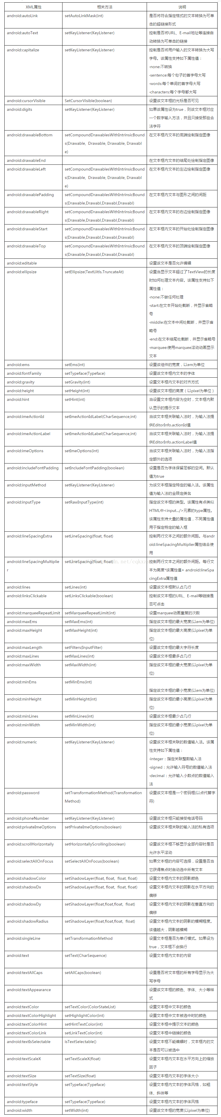 TextView提供了大量的XML属性,这些XML属性大部分不仅可适用于TextView,而且可适用于它的子类(EditText、Button等)。下表显示了TextView支持的XML属性及相关方法。