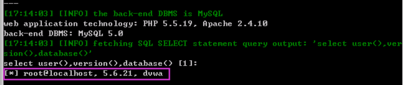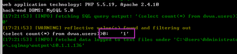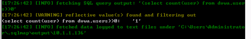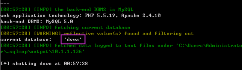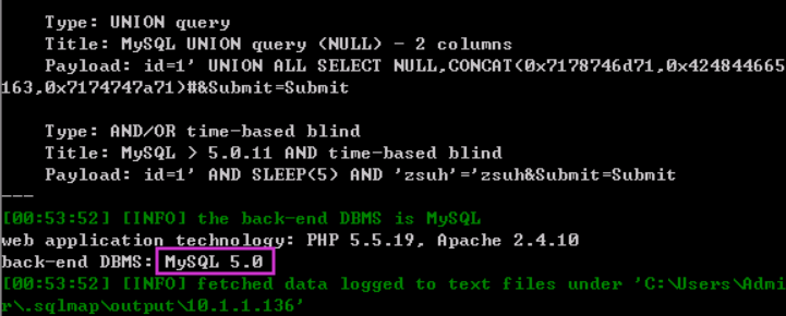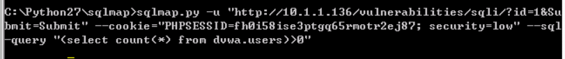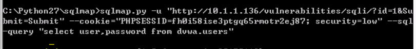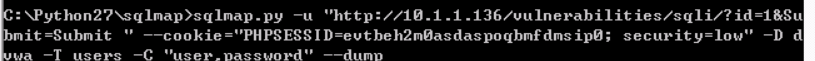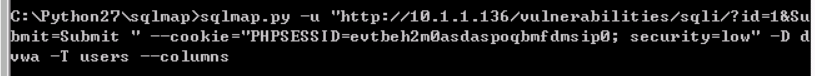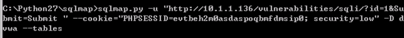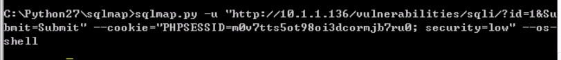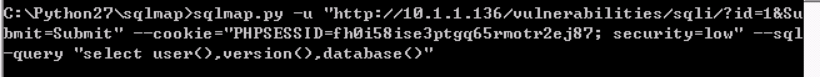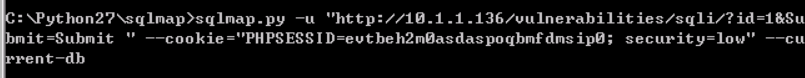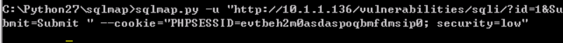 输入:sqlmap.py -u "http://10.1.1.136/vulnerabilities/sqli/?id=1&Submit=Submit" --