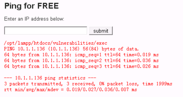 成功写入2个shell,一个用来执行命令的,另一个是用来上传的,打开链接:http://10.1.1.136/vulnerabilities/exec/tmpugbxb.php