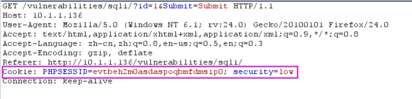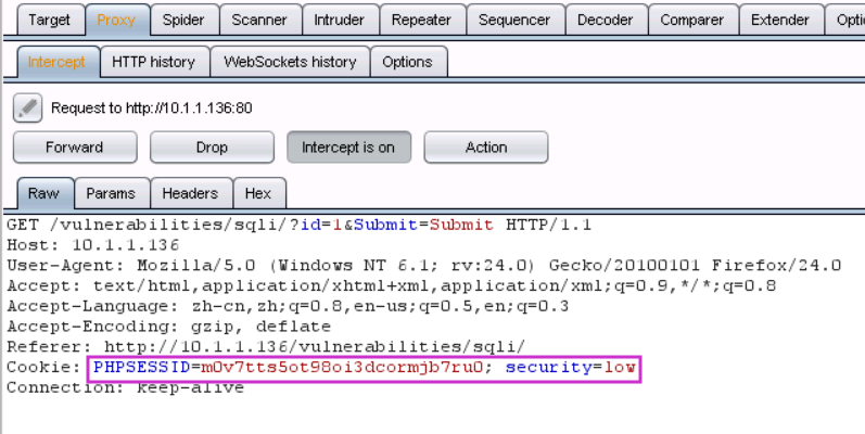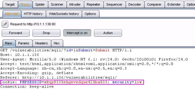 选择SQL Injection,输入一个数,使用burpsuite进行抓包,获取cookie