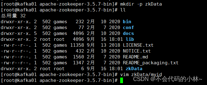 2.创建zkData文件夹,并在文件夹内创建myid文件作为这台服务器的唯一标识