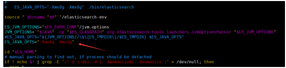 修改 bin/elasticsearch 文件,将 ESJAVAOPTS 修改为:ES_JAVA_OPTS="-Xms1g -Xmx1g",如下图所示: