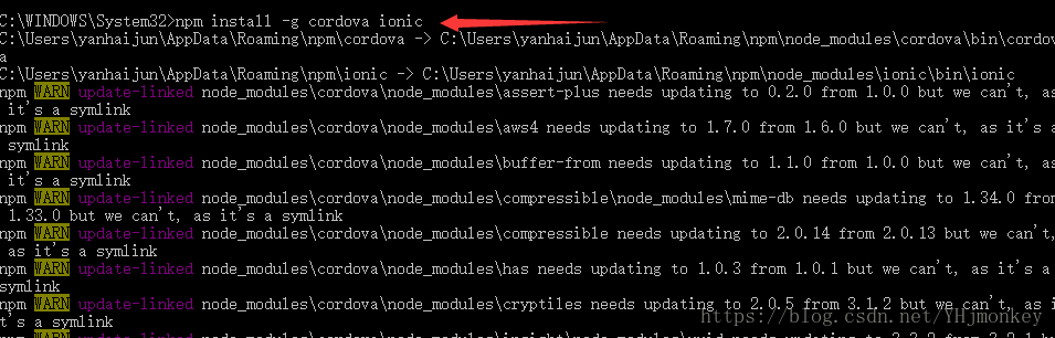 然后用:npm install -g cordova ionic安装,当然如果你在之前已经安装过cordova,前面的命令就不需要cordova.