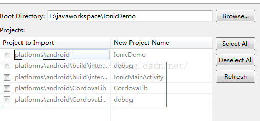 1,我之前在安装cordova时,同样将项目导入过eclipse中(共如下5个项目),现在要导入ionic项目时要先在eclipse中删掉红线框住之前已导入的这4个项目,然后在导入ionic时再一并导入,不然项目会出错,原因应该是生成ionic项目时,其他文件都有所更新。