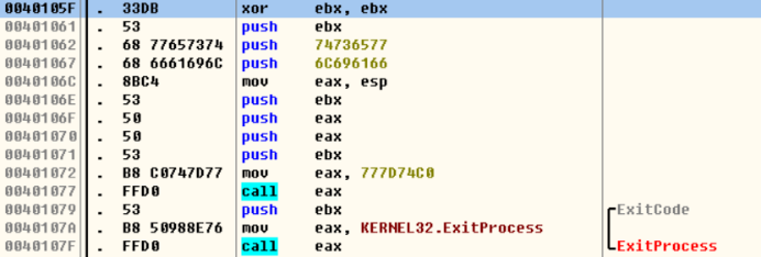 #include<iostream> using namespace std; int main() { //777D74C0 768E9850 char Shell_Code[]= "x66x81xECx40x04" "x33xDB" "x53" "x68x77x65x73x74" "x68x66x61x69x6C" "x8Bxc4" "x53" "x50" "x50" "x53" "xB8xC0x74x7Dx77" "xFFxD0" "x53" "xB8x50x98x8Ex76" "xFFxD0"; _asm { lea eax,Shell_Code push eax ret } return 0; }