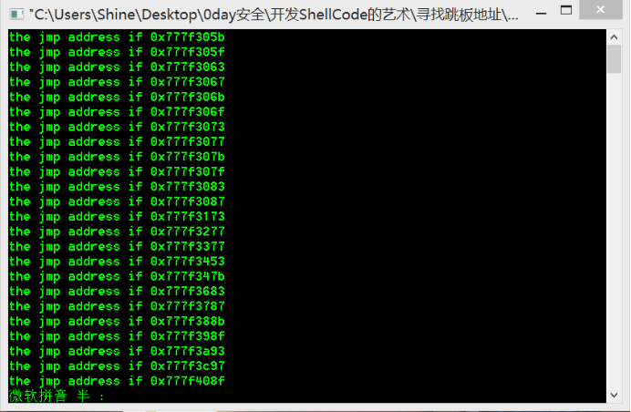 1 #include<iostream> 2 #include <WINDOWS.H> 3 using namespace std; 4 5 int main() 6 { 7 BYTE* ptr = NULL; 8 int position = 0; 9 int address = 0; 10 BOOL bDone = FALSE; 11 HINSTANCE handle = LoadLibrary("user32.dll"); 12 13 if(handle==NULL) 14 { 15 printf("Dll Load Failed!"); 16 exit(0); 17 } 18 19 ptr = (BYTE*)handle; 20 21 for (position=0;!bDone;position++) 22 { 23 try 24 { 25 if(ptr[position]==0xFF&&ptr[position+1]==0xE4) 26 { 27 //OxFFE4 是 jmp esp 的汇编指令 28 address = (int)ptr +position; 29 printf("the jmp address if 0x%xn",address); 30 break; 31 } 32 33 } 34 catch (...) 35 { 36 address = (int)ptr +position; 37 printf("End of 0x%xn",address); 38 bDone = TRUE; 39 } 40 } 41 42 return 0; 43 }
