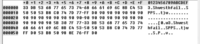 为了提取汇编代码的对应的机器码,我们将上述代码用VC编译通过之后,通过OD加载调试,获取该段汇编的机器码,机器码如下: